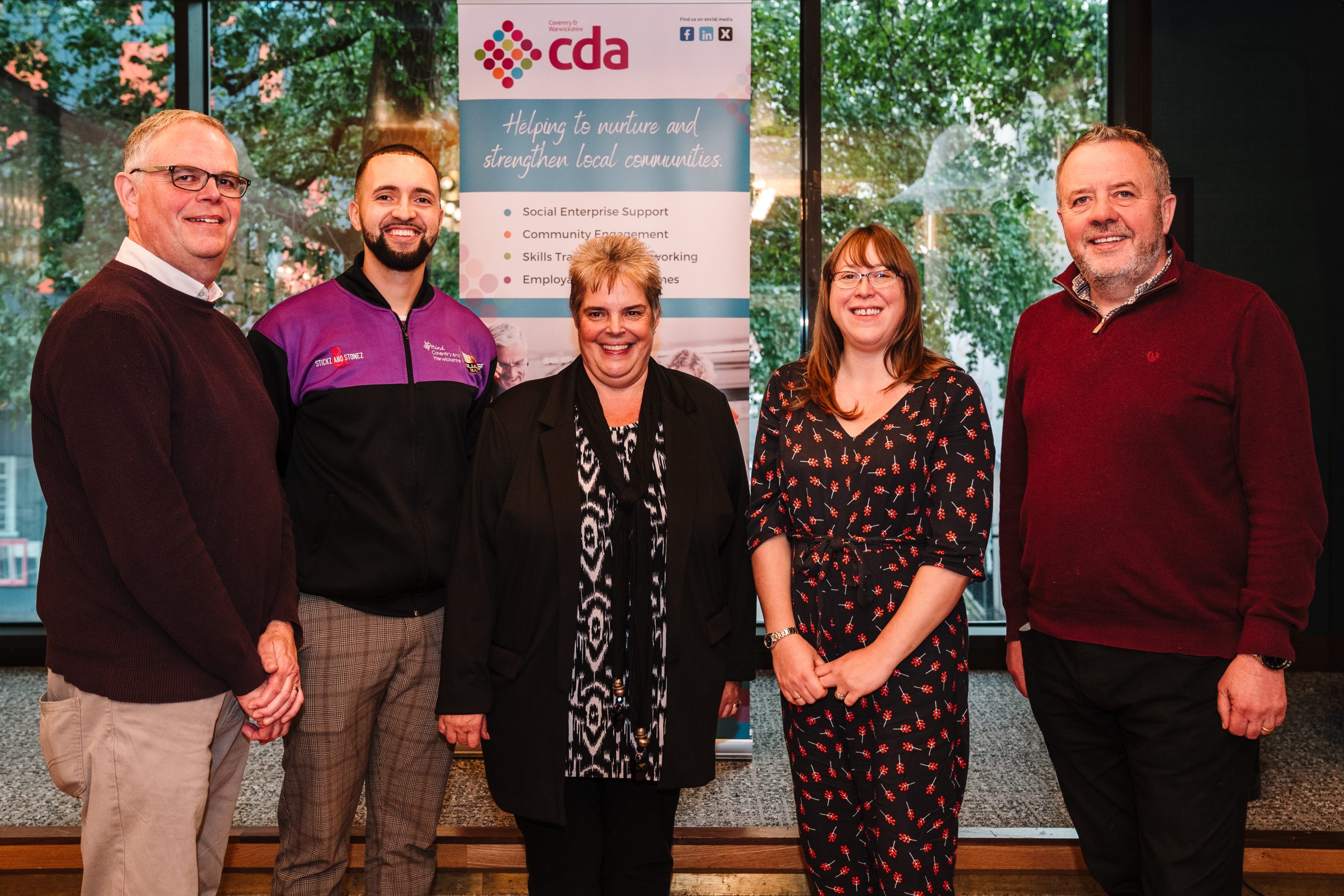 - Photograph Belgrade Theatre Event Photo Credit: Claire Keogh – Poppy K Photography. Speakers at the Social Economy Drive event, Wednesday 15 November at Belgrade Theatre. Left to right: Tim Rees – Entrepreneur, Kieran Joseph – Guardian Ballers, Mandy Bygrave – CWCDA, Alison Philips – Kindred CSR, Michael Mogan mbe – Mogan and Mogan